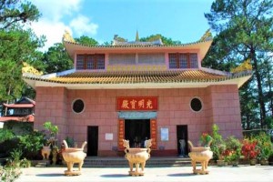 Các bạn theo đường bậc cấp Vào cổng tam Quan. Du khách sẽ đến Điện thờ Phật di Lạc và Tứ đại Thiên Vương. Và Tiếp đến sẽ đến Quang Minh Bảo Điện . Được Trang trí kỳ công với những hình tượng Lưỡng Long . Trên Nóc mái ở đỉnh có hình hai con Rồng chầu vào.